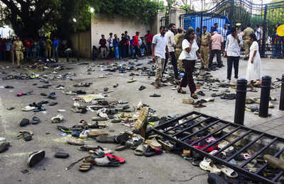 Footwears lie on the ground outside the Chinnaswamy Stadium following a stampede. (PTI Photo)