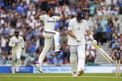London: The centre square at the Oval wore a deserted look till 30 minutes before start of play on the fourth morning. Unlike the other days of this final Test of the series, there weren’t players queuing up to go through their warmup drills. Yet, you could cut the tension all around with a knife. India were conserving their three strike bowlers — Mohammed Siraj, Prasidh Krishna and Akash Deep, while England’s Harry Brook and Joe Root took a few throwdowns and retired to the dressing room.These characters played lead roles in turning the arena into a bullring, throwing gruesome punches at each other before rain and bad light 75 minutes into the last session, took the series into its final dramatic fifth day. India will come back on Monday morning, four wickets away, with 34 runs in the bank, from finishing the series at 2-2. Brook batted like a man on steroids to score 111 off 98 while Root played the monk who had the entire field under his control as he hit 105 off 152 after they got together an hour into the first session with England, in pursuit of 374 on a tricky pitch, looking nervy at 106/3.
