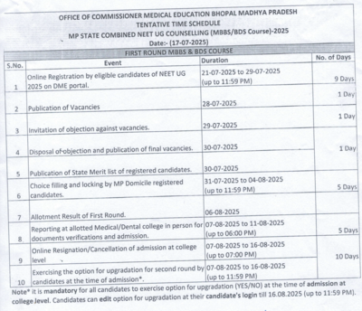 The Directorate of Medical Education (DME), Madhya Pradesh has shared the schedule for Madhya Pradesh National Eligibility cum Entrance Test Undergraduate (MP NEET UG) 2025 counselling. Students who have cleared the NEET UG 2025 examination will be able to register for counselling on the official portal — dme.mponline.gov.in, once the application link is activated.Recently, the Madhya Pradesh High Court put a hold on its judgment regarding a petition for a re-examination of NEET UG 2025. The petition was filed by students affected due to power failures at exam centers in Indore and Ujjain. The court was reviewing an appeal from the National Testing Agency (NTA) against an earlier decision that called for a re-exam for those candidates.Seat allocation for NEET UG 2025 counselling will be based on a combination of NEET scores, available seats, reservation guidelines, and candidates’ submitted preferences.