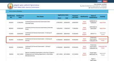 The Tamil Nadu Public Service Commission (TNPSC) has released the hall tickets for Combined Civil Services Group 1A examination. Candidates who registered to appear for the prelims can now download their hall ticket by visiting the commission’s official website, tnpsc.gov.in. As per the official schedule, TNPSC group 1 prelims will be conducted on June 15, 2025. To download the TNPSC group 1 hall ticket, candidates will have to login to the online portal using their credentials generated during the registration process. The hall ticket for TNPSC group 1 exam serves as an entry ticket for students. On the day of examination, candidates must carry a printed copy of their admit card along with them.