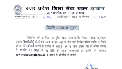 In an official notice, UPSESSB confirmed that the PGT written exam under Advertisement No. 02/2022, originally planned for mid-June, will not be held as scheduled. The decision to postpone the exam came from the commission citing unavoidable circumstances. This marks the third time the PGT examination has been rescheduled since the recruitment process began. The board has assured that fresh dates will be announced shortly to ensure candidates have adequate preparation time.Candidates can read the complete notice here.